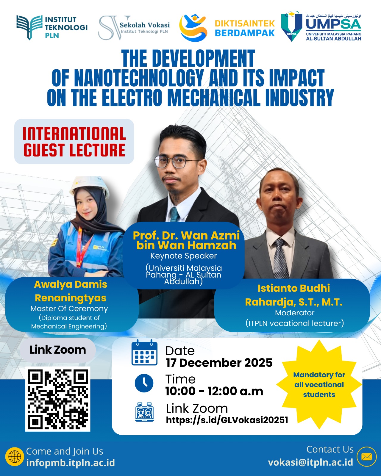 Sekolah Vokasi Institut Teknologi PLN telah menyelenggarakan International Guest Lecture dengan tema: “The Development of Nanotechnology and Its Impact on the Electro Mechanical Industry.”