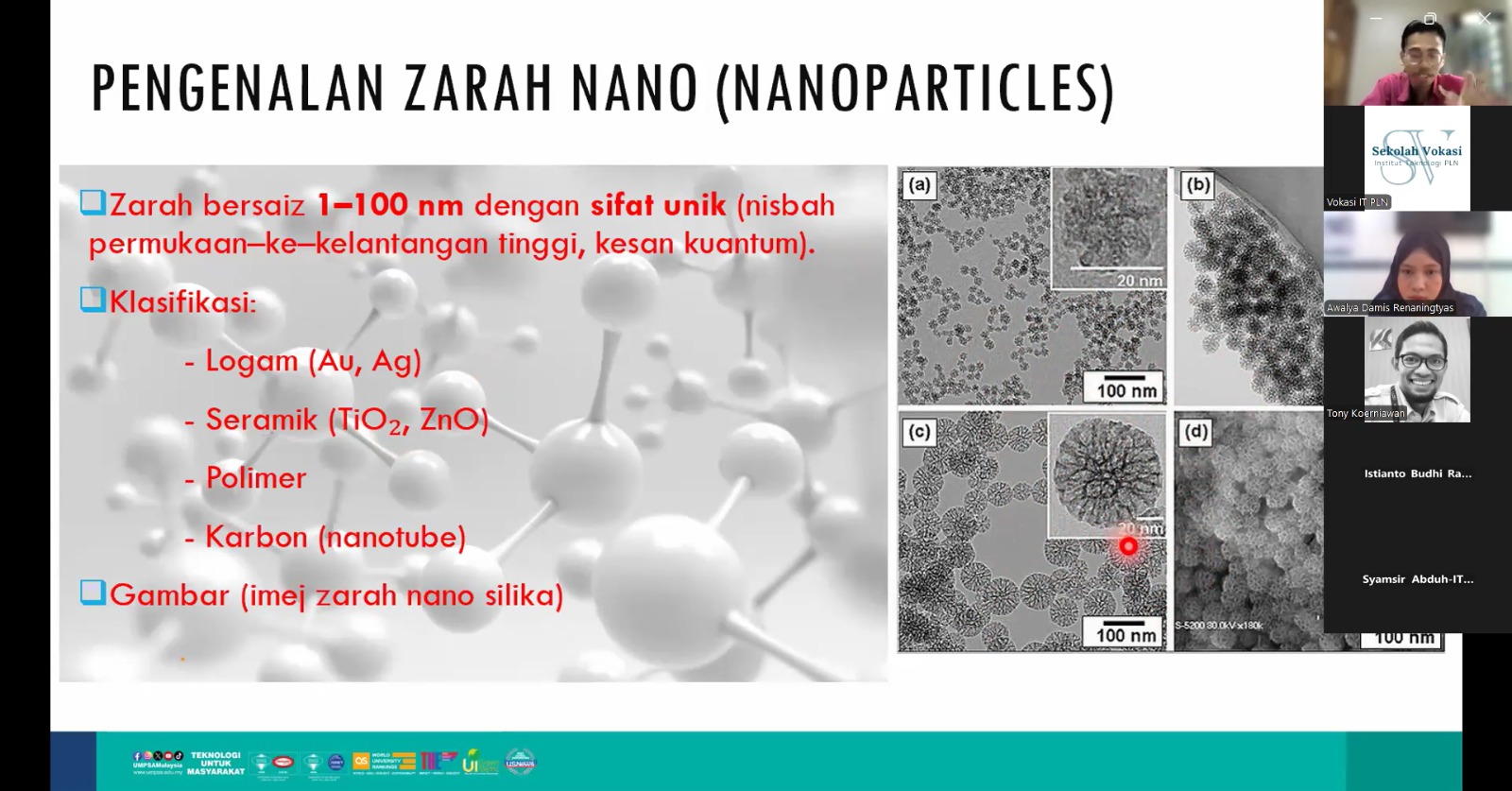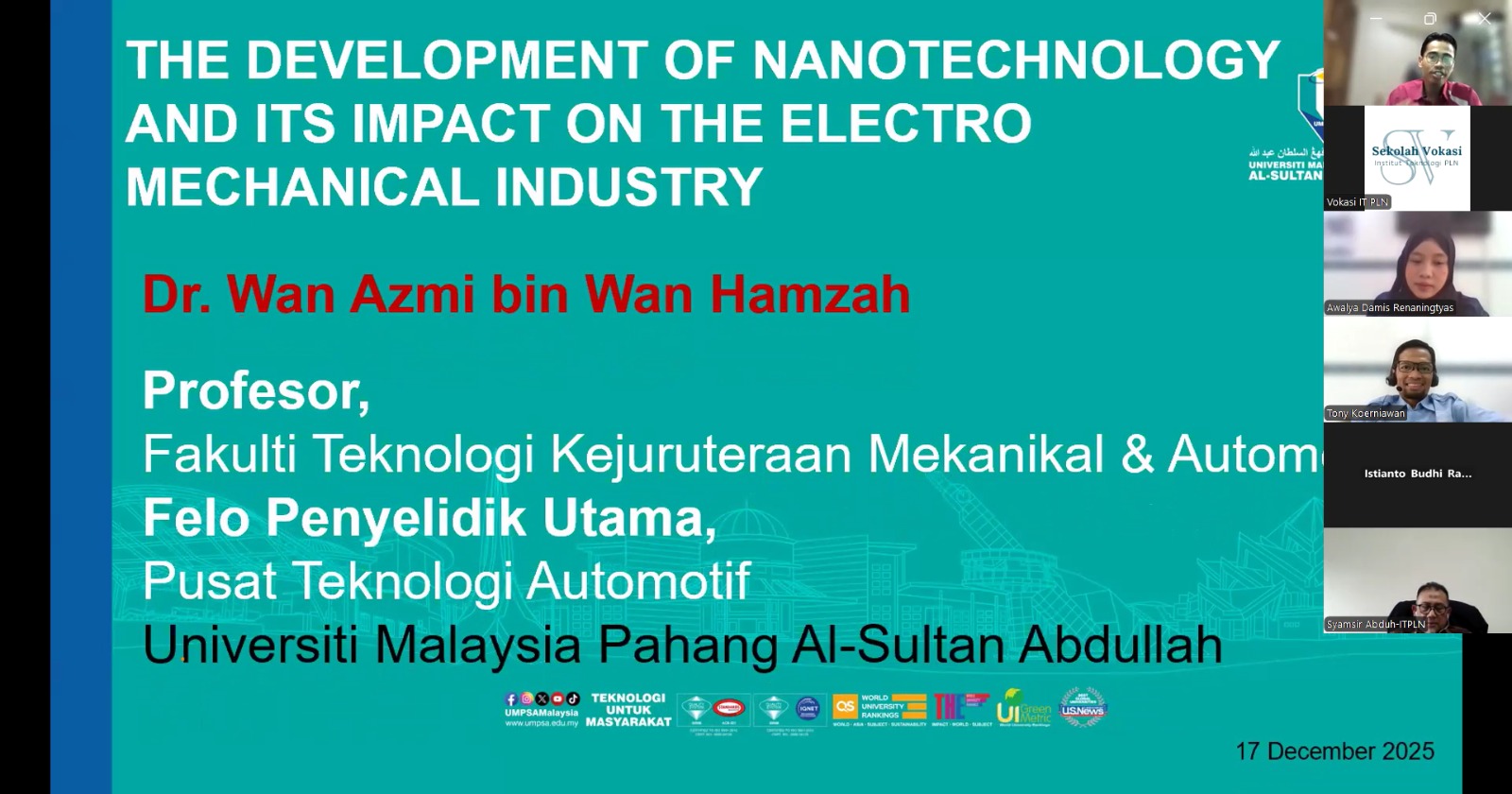 Kegiatan ini menghadirkan Prof. Dr. Wan Azmi bin Wan Hamzah dari Universiti Malaysia Pahang – Al Sultan Abdullah sebagai Keynote Speaker, yang memaparkan perkembangan nanoteknologi serta dampaknya terhadap industri elektro mekanik global. Acara dipandu oleh Istianto Budhi Rahardja, S.T., M.T., dosen Sekolah Vokasi, sebagai moderator, serta Awalya Damis Reraningtyas, mahasiswa D3 Teknik Mesin, sebagai Master of Ceremony.